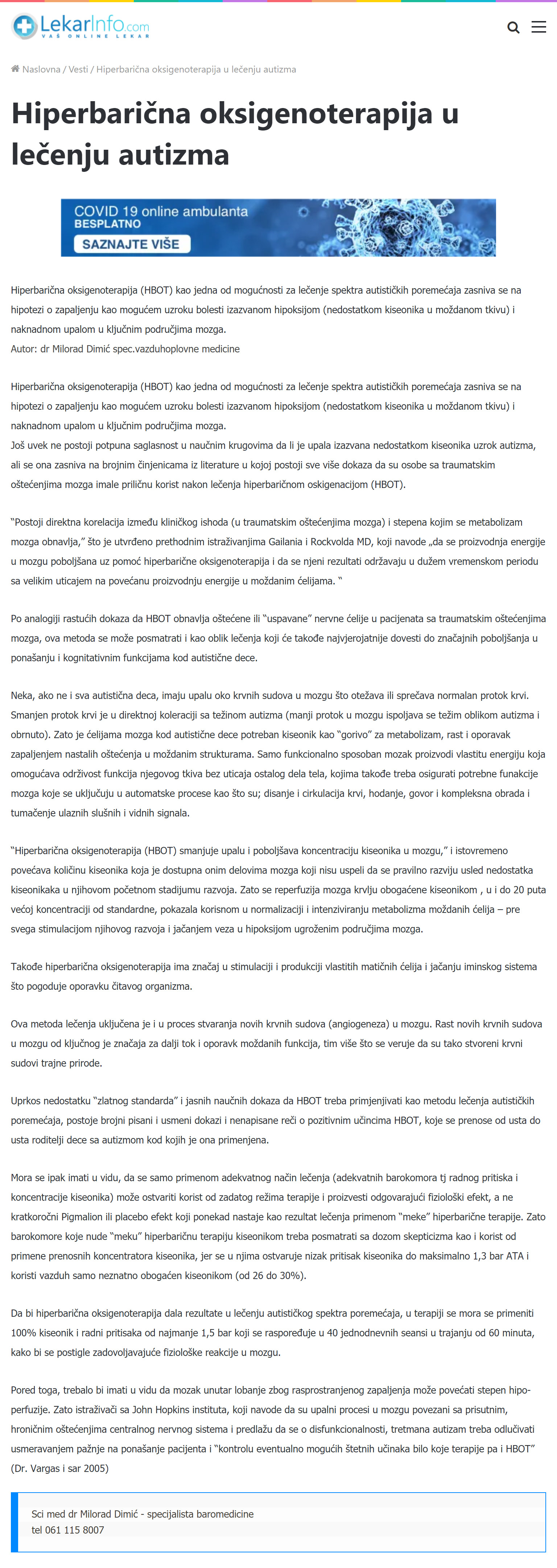 "Nesumnjivo je da svaki povećan unos kiseonika , posebno kada je pod povišenim pritiskom ima pozitivan efekat na organizam. Nije etički reklamirati hiperbarične tretmane u mekim-soft komorama kada se zna da su njihovi rezultati i više od 10 puta slabiji od očekivanih posebno za medicinske indikacije (akutno trovanje CO, sepsa, gasna embolija i gasna gangrena, Kraš sindrom, kompromitovani transplantati, ostiomielitis, opekotine, dijabetične angiopatije, nezarastajuće rane, MS, autizam kod dece…)", kaže Velevski.